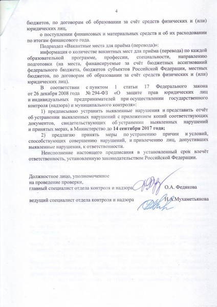 Предписания органов, осуществляющих государственный контроль (надзор) в сфере образования, отчеты об исполнении таких предписаний (при наличии)